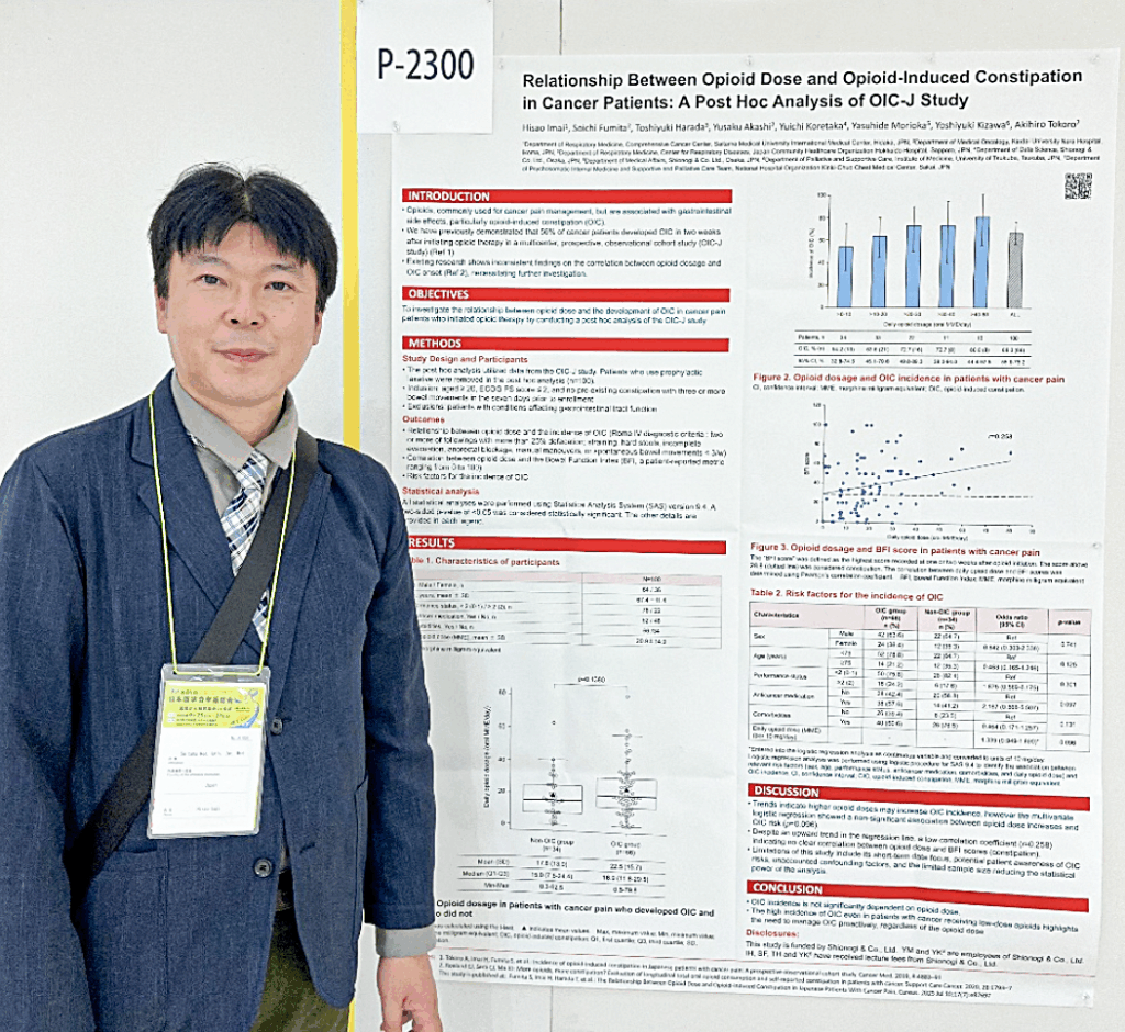 解析の結果、オピオイド投与量の増加と OIC 発症リスクとの関係性が示唆され、臨床現場における疼痛緩和と副作用マネジメントの両立の重要性について議論しました。会場では、がん疼痛治療や支持療法の専門家から多くの質問と意見が寄せられ、活発な意見交換の機会となりました。